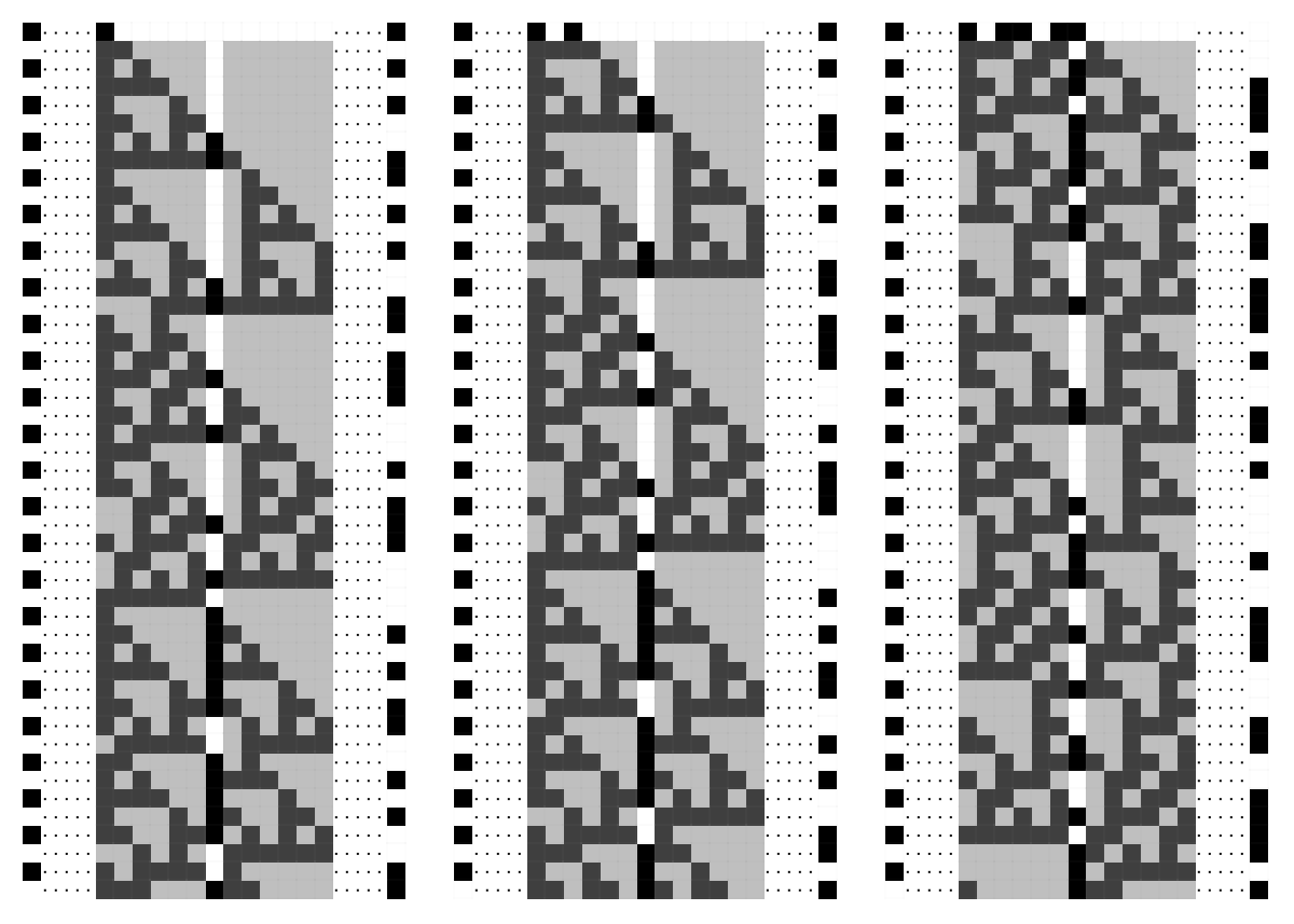 The picture below shows one way of generating encrypting sequences that was widely used in the early years of electronic cryptography, and is still sometimes used today. The basic idea is to look at the evolution of an additive cellular automaton in a register of limited width. The key then gives the initial condition for the cellular automaton, and the encrypting sequence is extracted, for example, by sampling a particular cell on successive steps.